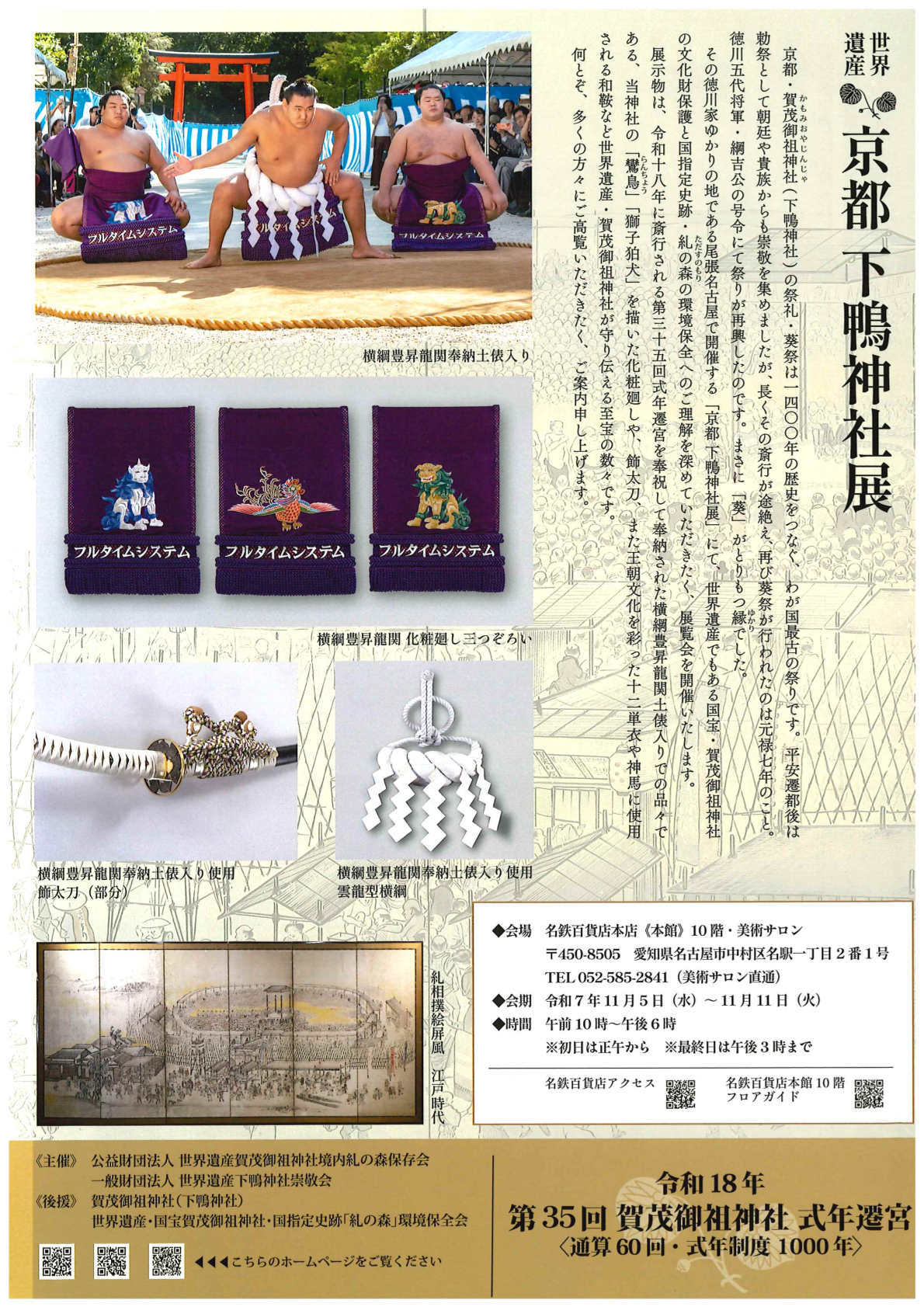 ・ 鴨相撲の記憶と現代の奉納が交差江戸初期、糺河原で興行された勧進相撲は「京都相撲の始まり」と伝えられます。本展では、第74代横綱・豊昇龍関による奉納土俵入り(令和7年10月9日)で実際に用いられた、下鴨神社所蔵の鸞鳥・獅子・狛犬意匠による特別化粧廻しや関連資料を、名古屋で特別公開。下鴨神社における相撲文化の淵源と、現代の奉納がつながる“瞬間の記憶”をご覧いただけます。