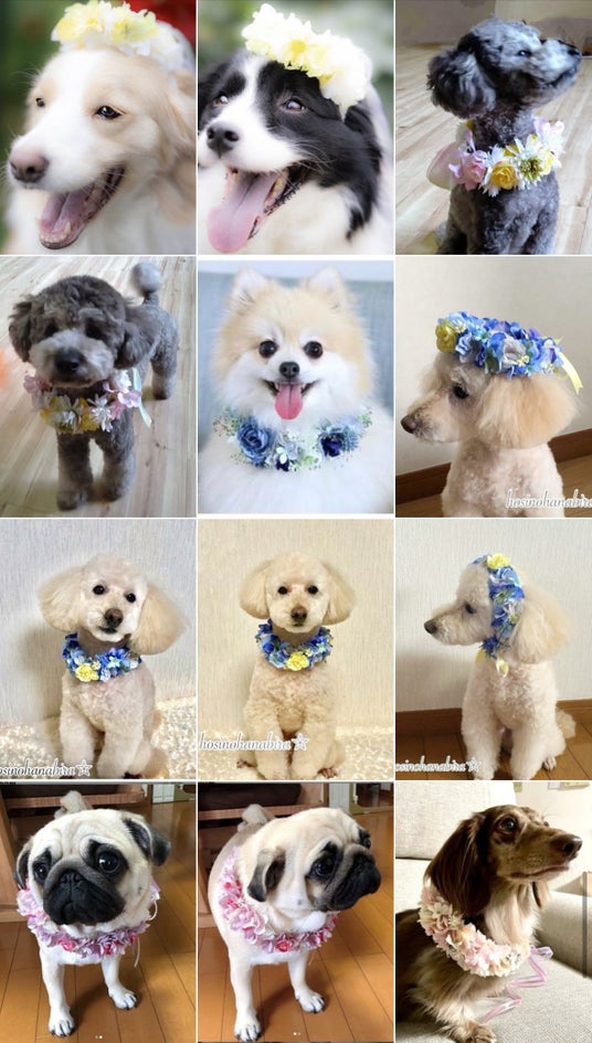 日本一安全な花かんむりが登場!一切ワイヤーつかいません。一般の方が作った花かんむりをつけた ワンちゃん ねこちゃんの写真が並びます。やわらか花かんむりとして、特許意匠登録済