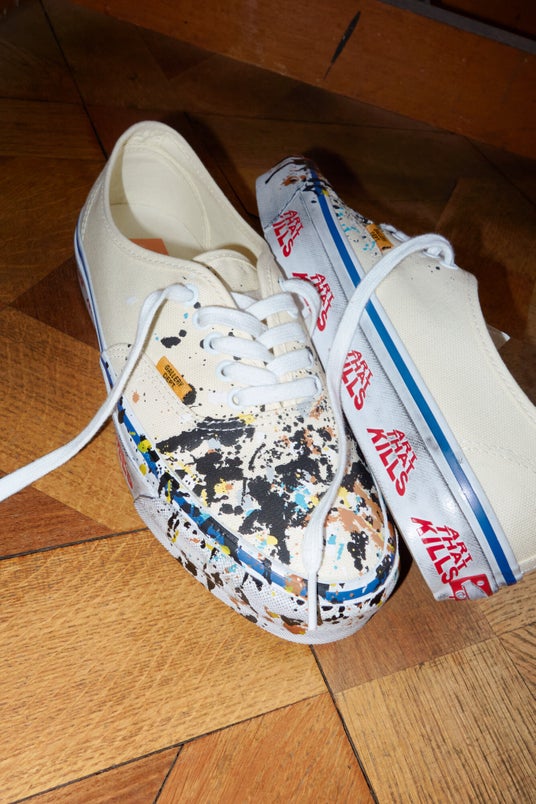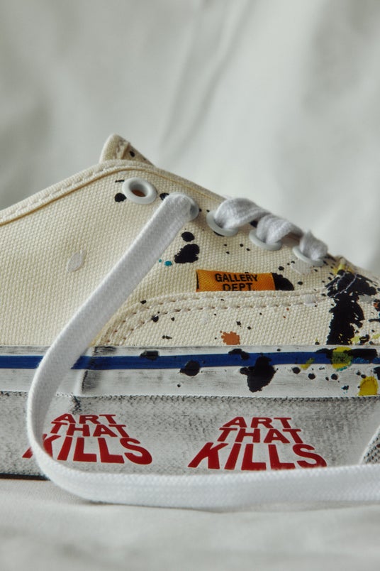 トゥ部分に広がるペイントのしずくや、 バンプとサイドウォールに施された丁寧に施されたユーズド加工が、独特の深みと質感を演出しています。サイドウォールに刻まれた「Art That Kills」というGallery Dept.のスローガンは、妥協を許さない芸術表現の本質と力強さを象徴しています。