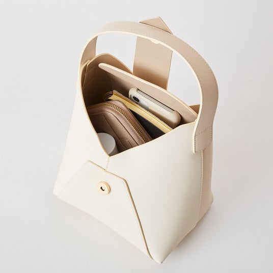 普段使いにちょうど良いサイズ感で、財布、スマートフォン、ポーチ、ハンドタオル、手帳、500mlペットボトルなどが入り、荷物が多くなる外出時にも対応した収納力です。被せが付属しているため、バッグの口を閉じると中身が見えないという細やかな心配りも。バッグの底に鋲が付属しているため単体で自立するのも嬉しい。