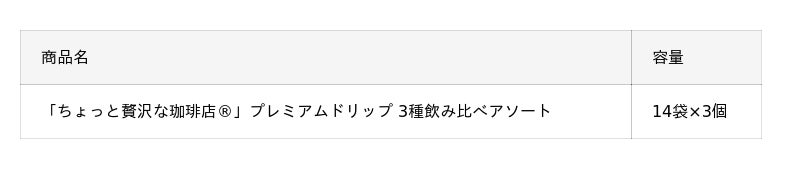 個包装タイプのドリップコーヒー《「ちょっと贅沢な珈琲店(R)」プレミアムドリップ》の〈スペシャル・ブレンド〉〈モカ・ブレンド〉〈キリマンジャロ・ブレンド〉の3種類の味わいを飲み比べして愉しめる、アソートパック。