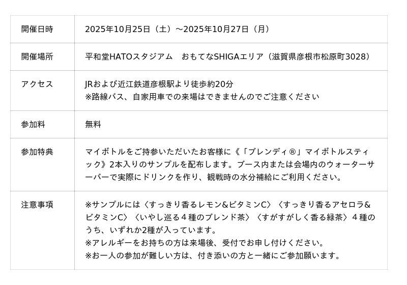 「ココロとカラダの健康」への貢献を目指す味の素AGF株式会社(代表取締役社長:島本 憲仁 以下、味の素AGF)は、2025年10月25日(土)から10月27日(月)の3日間、滋賀県で行われる「第24回全国障害者スポーツ大会」において、株式会社平和堂(代表取締役社⾧執行役員CEO:平松正嗣、以下、平和堂)と共同で脱プラスチックを推進する「マイボトルではじめよう プラチャレ!ウォータースタンド」のブースを出展します。