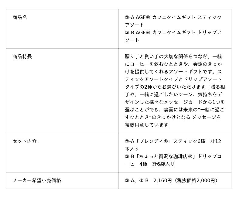 2.メッセージを添えて、ちょっとしたプレゼントに 2.-A AGF(R) カフェタイムギフト スティックアソート /2.-B ドリップアソート
