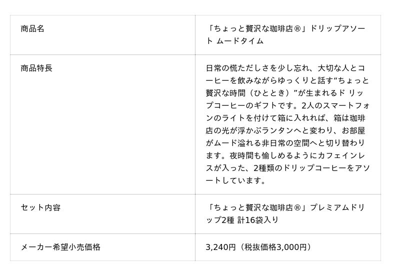 《「ちょっと贅沢な珈琲店(R)」ドリップアソート ムードタイム》は、スマートフォンのライトを付けて箱に入れれば、箱が珈琲店の光が浮かぶランタンへと変わり、ランタンの光が照らす非日常な空間でスマートフォンを手放し、いつもとは違う、ゆったりとした中でコーヒーの香りに包まれながら「語らいのひととき」を過ごしていただけるような工夫が施されています。