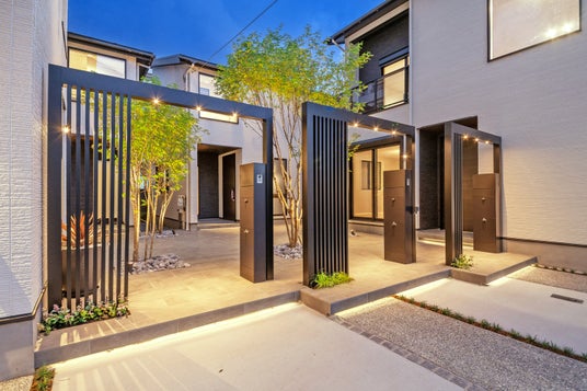 ペイブを連続させた外構と、門柱を道路に直角配置する設計により、敷地内のゆとりとセキュリティを両立しました。外観・内装は奥と手前で2種類を設定。手前区画は切妻屋根で将来の太陽光設置に配慮し、バルコニーや袖壁など安全性と意匠性を向上。内装は手前をダーク系で上質に、奥は明るい色調で開放感を演出しています。