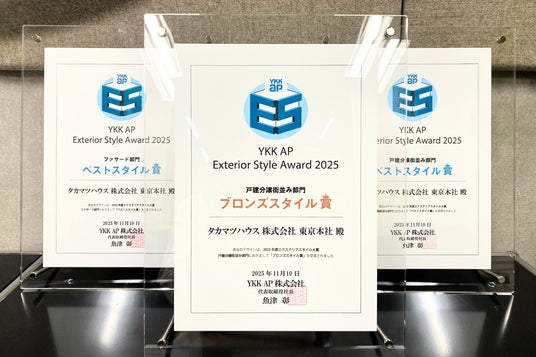 タカマツハウス株式会社(本社:東京都渋谷区、代表取締役社長:藤原元彦、以下「タカマツハウス」)は、YKK AP株式会社(本社:東京都千代田区、代表取締役社長:魚津 彰)が主催するYKK AP エクステリア スタイル大賞2025において、戸建分譲街並み部門ブロンズスタイル賞およびベストスタイル賞、ファサード部門にてベストスタイル賞を同時受賞しましたことをお知らせいたします。