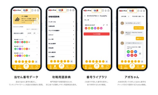 - AIチャットボット「アポちゃん」:AI技術を用いて、期待値の高い番号をチャット形式で提案するChatbot機能。ユーザーがチャットを通じて自然な対話で分析を得ることが可能です。