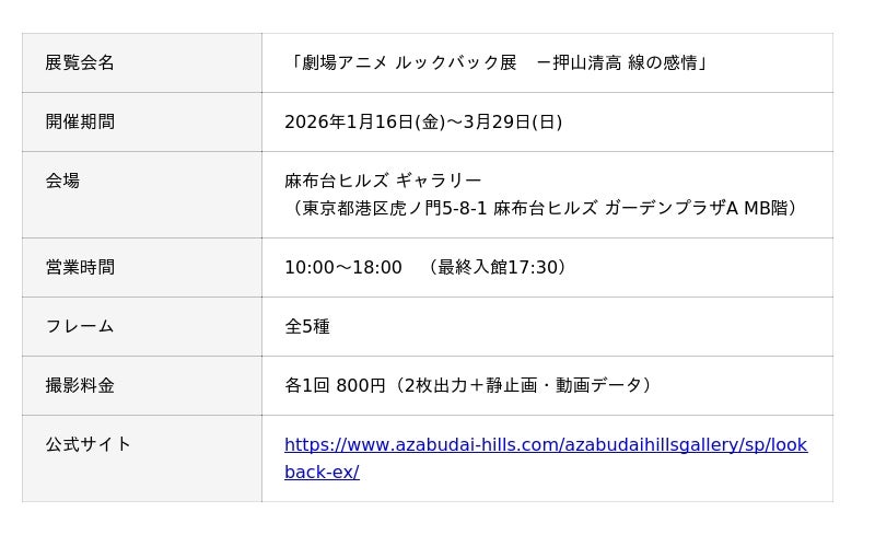キタムラ・ホールディングス グループのピックハイブ株式会社(本社:東京都新宿区、代表取締役社長 兼 COO:大迫 由典)が運営するセルフフォトブランド「Photomatic(読み:フォトマティック)」は、2026年1月16日(金)から麻布台ヒルズ ギャラリーで開催される「劇場アニメ ルックバック展 -押山清高 線の感情」において、コラボレーションフレームで撮影できるセルフフォトブースを設置いたします。劇場アニメ『ルックバック』の名シーンがデザインされたフレームをはじめ、展覧会のテーマである「線」の魅力を凝縮した全5種のコラボレーションフレームを限定発売。作品の世界観と一体になれる、本展覧会ならではの特別な撮影体験を提供いたします。