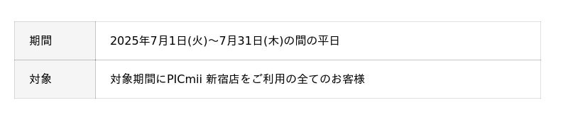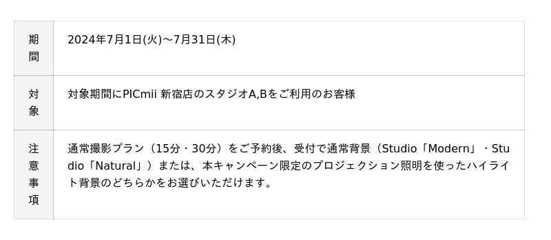 2025年7月1日(火) ~7月31日(木)の平日限定で、すべてのスタジオで撮影時間を5分延長してご利用いただけます。撮影プラン15分は20分に、撮影プラン30分は35分へ延長いたします。