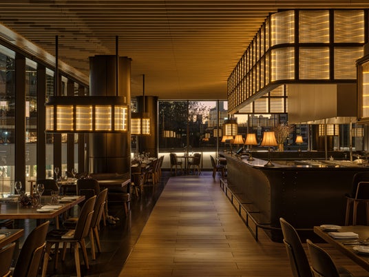 オープンキッチンのライブ感とネオクラシックな雰囲気の中でグリル料理を。窓からはダイナミックな東京タワーの景色、そして5月11日までは、中央広場に設置された松山智一氏の屋外彫刻作品をお楽しみいただけます。