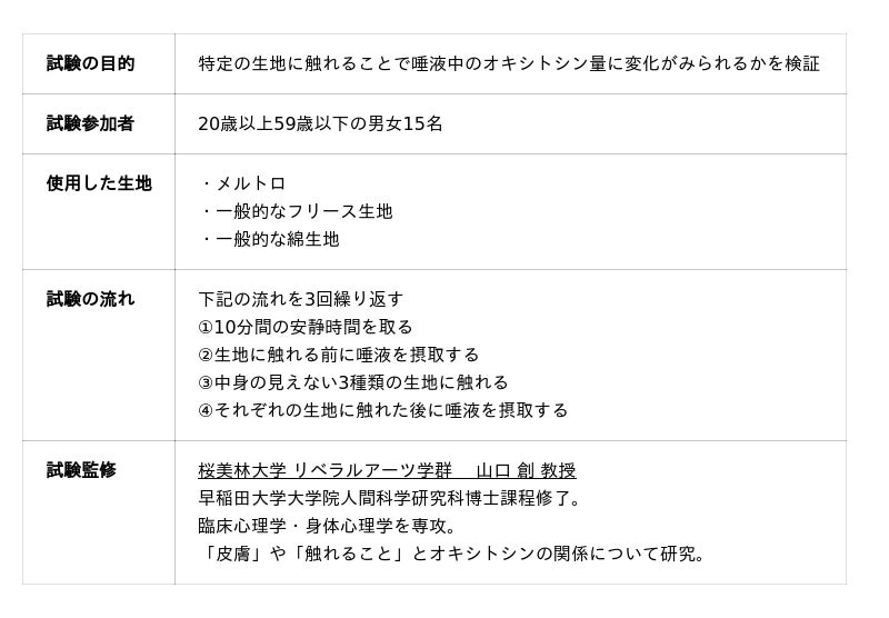 今回の価格改定および商品発売に先立ち、当社では「メルトロ」を使用し、「特定の生地に触れることで唾液中のオキシトシン分泌量に変化がみられるか」を検証する試験を実施しました。その結果、「メルトロ」の生地に触れた際、唾液中のオキシトシン分泌量が上昇する傾向が確認されました。