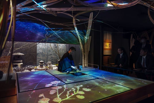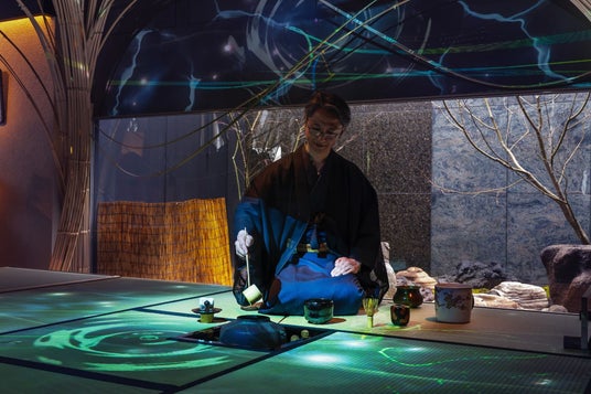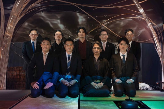 『貴和』ならびに「NIWA」は、茶道裏千家の協力のもと、華道家元池坊、いけばな草月流、造園 植治といった伝統の継承者たちと共に創り上げられたアート空間。亭主の所作が光の軌跡として浮かび上がる演出には、川尻自身が「日本人が大切にしてきた美意識や間の取り方、もてなしの心が可視化され、芸術として昇華されている」と語るように、深い精神性と現代アートが融合しています。