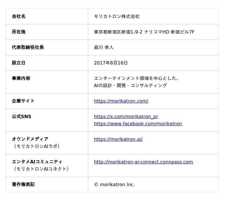 また、オウンドメディア「モリカトロンAIラボ」の運営や、自社主催イベント「モリカトロンAIコネクト」を通じて、エンタメAIの最新情報を共有し、業界全体の活性化に寄与する取り組みを推進しています。