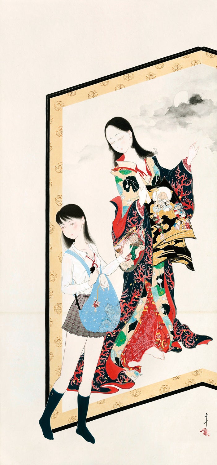 もって少女や妖怪、八百万の神々、おかめなどを描いていきます。現実と虚構が