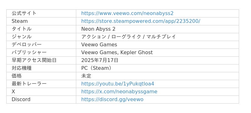 最新情報については、公式サイト www.neonabyss.com/ をご覧いただき、公式Xアカウントをフォロー、公式Veewo Discordにもぜひご参加ください。
