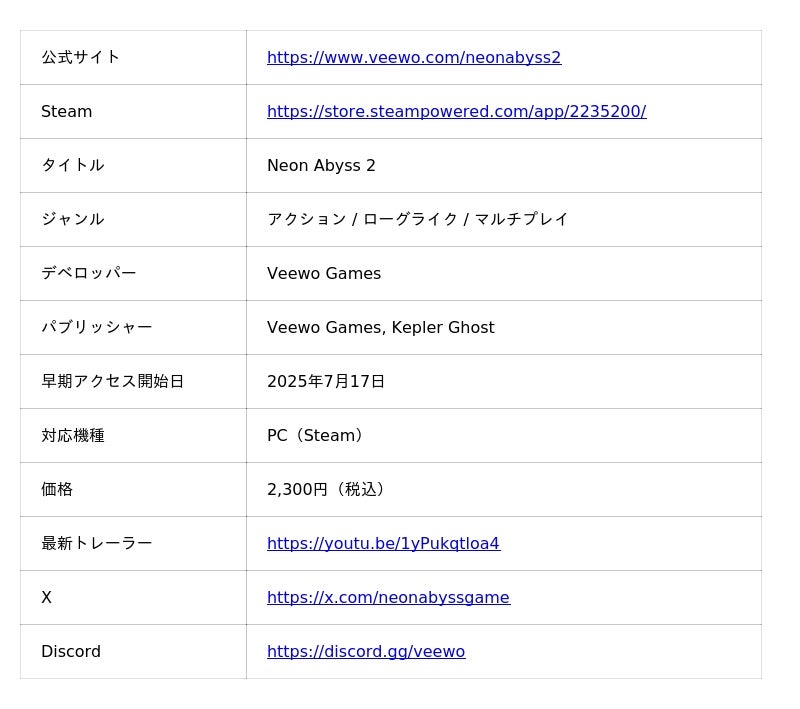 今後の大型アップデートや家庭用ゲーム版のリリース予定などの最新情報をチェックするために、公式サイト www.veewo.com/neonabyss2 をご覧いただき、公式Xアカウントをフォロー、公式Veewo Discordにご参加ください!