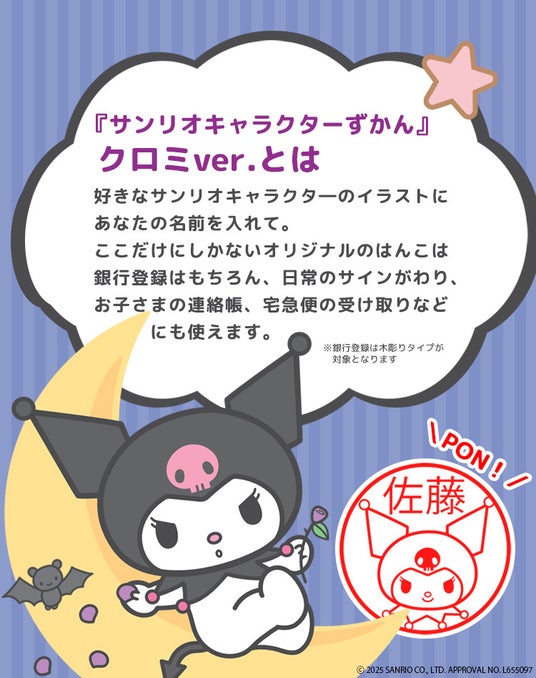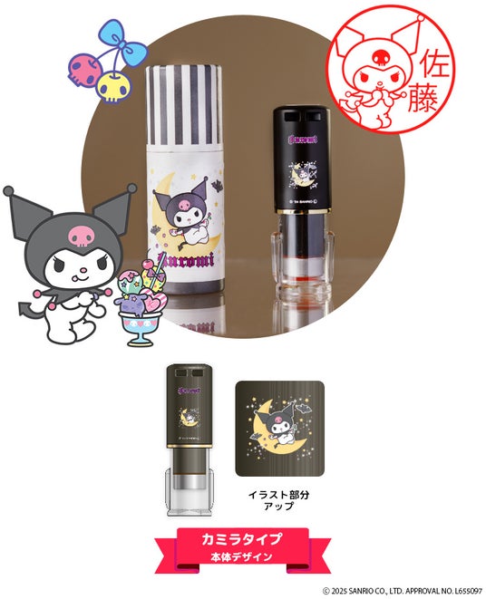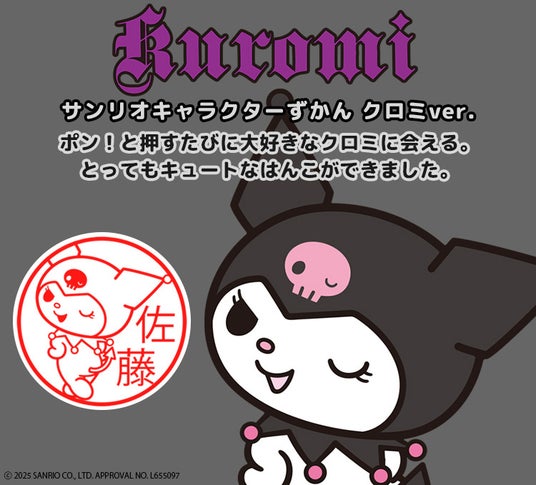 黒いずきんとピンクのどくろがチャームポイント。サンリオの人気キャラ・クロミのイラストと好きな名前でつくれるはんこに新タイプが登場。荷物の受け取りやサインがわり、「みましたハンコ」としても使えます。