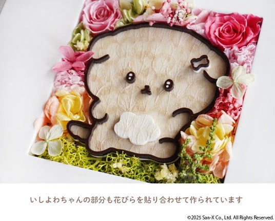 新作として登場したフラワーフレームは、「いしよわちゃん」のかわいらしさを色とりどりのプリザーブドフラワーで表現。いしよわちゃんのからだの部分は、あじさいの花びらを貼り絵のように一枚ずつ手作業で貼り合わせました。ふんわりとした独特のやわらかさに、ほっと心があたたかくなります。