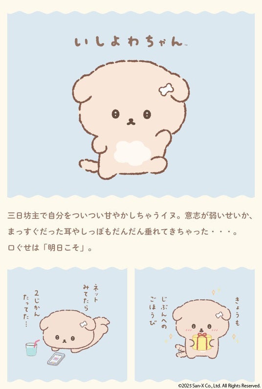 三日坊主で自分をつい甘やかしてしまうイヌのキャラクター「いしよわちゃん」。毎日フルタイムで働きながらわたしたちと同じような生活をする姿もあいまって共感者が続出している、SNSでも人気急上昇中のキャラクターです。マイペリドット店主が「いしよわちゃん」のファンであることから、今回の商品化が実現しました。