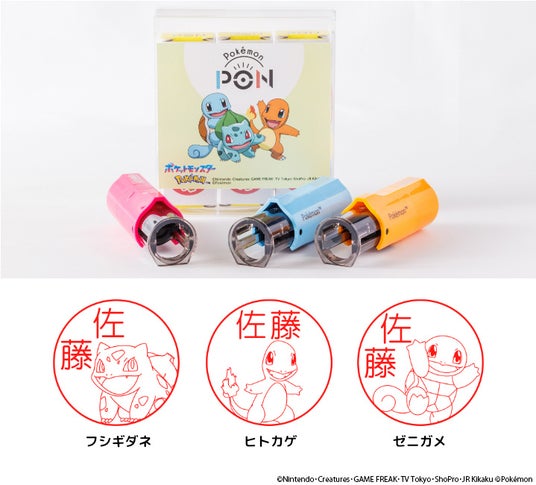 「Pokemon PON」は2018年11月に登場した、お気に入りのポケモンに好きな名前を入れて作れる、ポケモンファンにはたまらないはんこ。メモや付箋に押したり、お手紙に押したり、持ちものへのお名前つけに使ったり、お子さまの連絡帳や音読カードなどにポンポン押せるセルフインクタイプと、全国ほとんどの金融機関にも登録できる木彫りタイプ、黒水牛タイプから選べます。