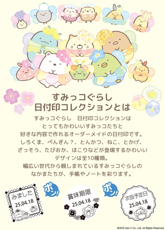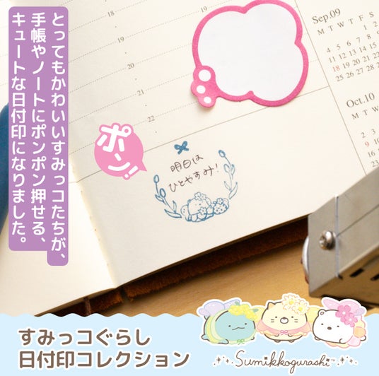 「すみっコぐらし 日付印コレクション」は、「手帳やノートに使える、すみっコぐらしの日付入りのはんこは作れませんか?」というご要望の声を受けて企画した、すみっコぐらしの日付入りはんこ。
