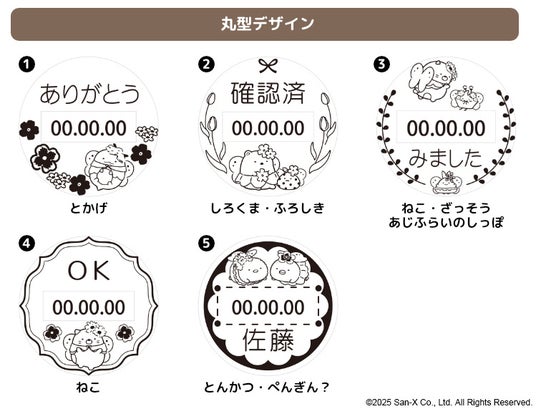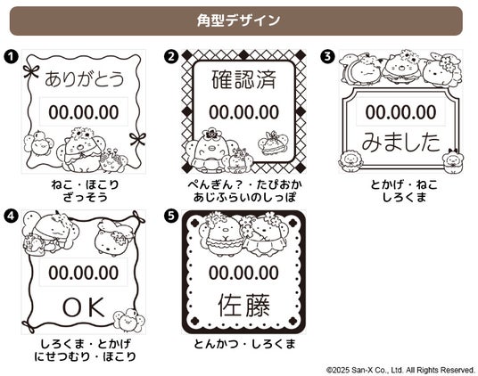 日付印のデザインは、丸型・角型あわせて合計10種類。しろくま、ぺんぎん?、とんかつ、ねこ、とかげなどのすみっコはもちろん、たぴおか、ざっそう、ほこりなどのみにっコたちが、おしゃれなフレームデザインになんともいえない可愛さを添えてくれます。