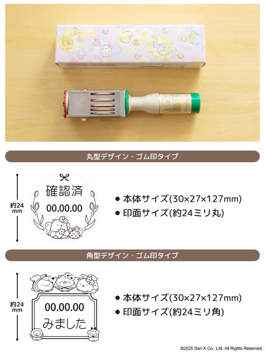 日付印本体のサイズは横30×縦27×高さ127ミリ。印面サイズは丸型が約24ミリ、角型が約24ミリ。スタンプ本体の持ち手部分や専用BOXにも、かわいいすみっコぐらしがあしらわれています。