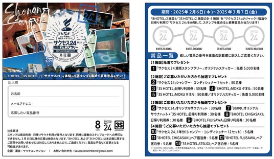 日本最大級のサウナメディア「サウナコレクション」の運営やサウナ施設・サウナ関連商材のマーケティング支援事業を行う株式会社HIDANE(本社:神奈川県横浜市 共同代表:山本 幹太、鈴木 翔、以下HIDANE)は、2025年2月6日(木)~2025年3月7日(金)の期間、湘南レーベル株式会社が運営する「8HOTEL」2施設と「3S HOTEL」2施設の計4施設の宿泊や日帰り利用で、若年男性の頭皮をスキンケアするシリーズ「サクセス24 シャンプー・コンディショナー」を体験して、スタンプを集めると豪華景品があたるスタンプラリーイベントを開催いたします。