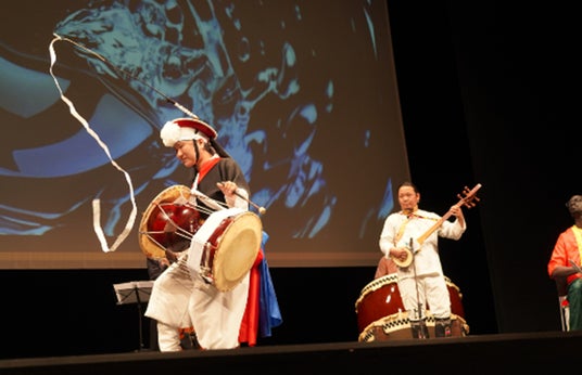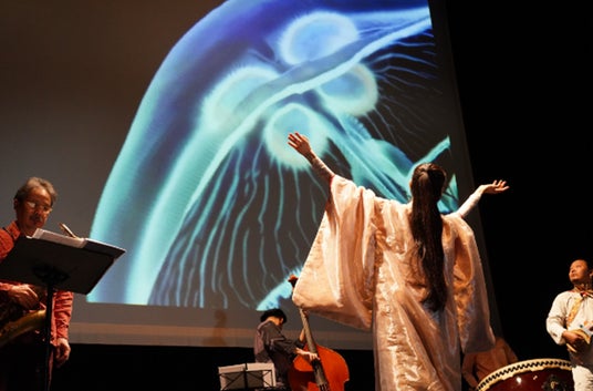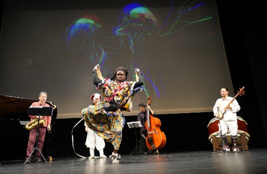 中島率いるクラゲバンドは、韓国太鼓のチェジェチョル、 セネガル太鼓のアブラインジャイローズ、チベット音楽のテンジンクンサン、カメルーンバカ族の音楽人類学者でありDJの矢野原佑史、和太鼓の佐伯篤宣、サックスの登敬三、鈴木広志、ベース織田洋介、ドラム小林武文、バレエの針山愛美、セネガル踊りのMomoなどさまざまな文化が協奏する場であり、今回は同じテーマ事業プロデューサーである落合陽一さんが手掛けた映像によるコラボレーションも実現。五感を揺らす、躍動的なライブが展開されました。