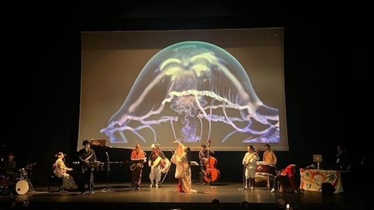 冒頭は、山本能楽堂による「いのちの能:水の輪」が演じられ、クラゲバンドは、クラゲ館のいのちの根っこ「わたしを祝う」で流れる「いのちの旅」(作曲:中島さち子)を奏で、日本からさまざまな国や地域をたどる時空をこえたいのちの旅が描かれました。音楽や踊りや想いや夢や・・・さまざまなものが分断を越えて協奏する世界。万博には、そんな可能性が溢れています。これからも、万博という機会を活用して、点と点をつなぎ、大きないのちの音楽を奏でていきます。