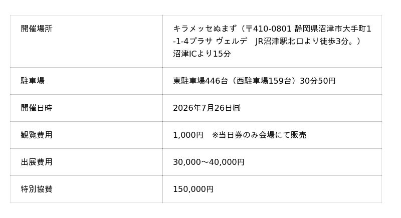 特別協賛企業を募集しております。クルマがメインのイベントですが、4社限定でクルマ以外の展示・PRブースを設けます。ブース設営にかかるパーテーションパネルやテーブル・椅子等は事務局で提供いたします。