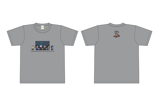 大阪中之島美術館の前を颯爽と行進するドット絵のキャラクターたちがポップなTシャツ。背面の襟元にはリオレウスと大カプコン展のロゴ入り。