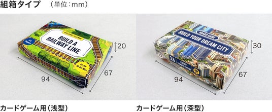 既製サイズパッケージに新たにトレーディングカードやトランプ、ボードゲーム用の箱としてご利用いただける「カードゲーム用」のパッケージを追加いたしました。キャラメル箱と組み箱の2形状で、全7種類をご用意しております。