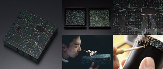 伝統的な螺鈿技法を守りながらも、レーザー機器など先端技術を組み入れることで、人の手と刃物ではできない極小のパーツを実現。新しい表現の追求に取り組んでいる。