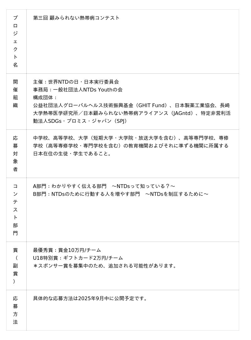 2025年7月7日、一般社団法人NTDs Youthの会は世界NTDの日・日本実行委員会の一員として「第三回 顧みられない熱帯病(NTDs)コンテスト」の開催を決定しました。顧みられない熱帯病(NTDs)とは世界保健機関(WHO)が定義する21の疾患群であり、主に熱帯地域の貧困層を中心に現在も15億もの人々が感染のリスクにさられています。本コンテストは、日本に住む学生に対してNTDsに関する認識を深め、持続可能な開発目標(SDGs)達成に向けた取り組みを促進することを目的としています。特にユース世代がNTDsを「自分ごと」として捉え、自分自身や日本がNTDs対策にどのように貢献できるかを考える場を提供します。2026年1月30日(金)の「世界NTDの日」において表彰式を開催する予定です。また、本コンテストに参画する団体も同時募集しています。