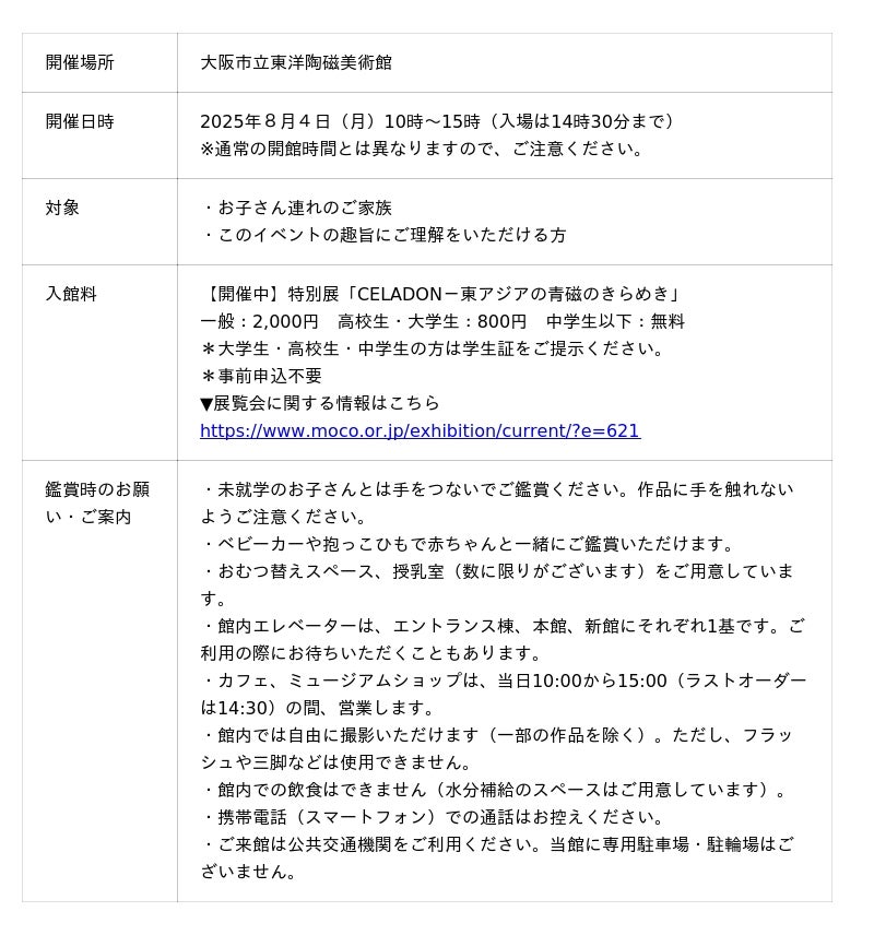 おしゃべりOK!ないてもOK!「MOCOファミリースペシャルデー」大阪市立東洋陶磁美術館にて 8月4日(月)開催決定!