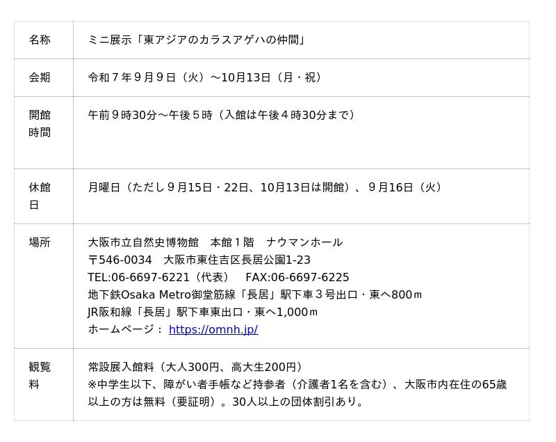 大阪市立自然史博物館では、令和7年9月9日(火)から10月13日(月・祝)まで、ミニ展示「東アジアのカラスアゲハの仲間」を開催します。