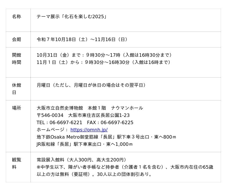 大阪市立自然史博物館では、令和7年10月18日(土)から11月16日(日)まで、テーマ展示「化石を楽しむ2025」を実施します。