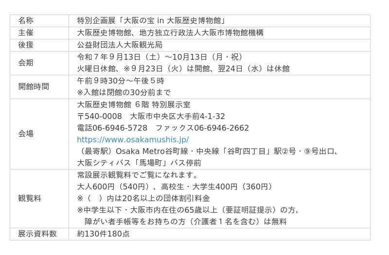 大阪歴史博物館では、令和7年(2025)9月13日(土)から10月13日(月・祝)まで、6階特別展示室において、特別企画展「大阪の宝 in 大阪歴史博物館」を開催します。