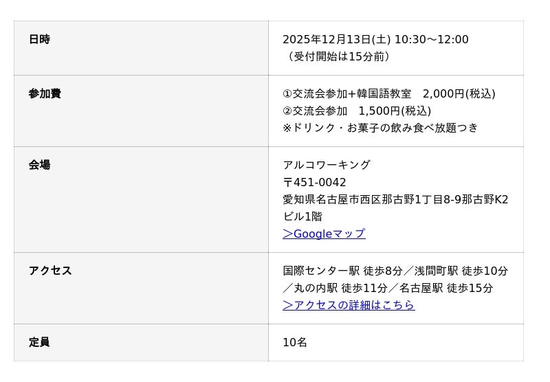 2025年12月13日(土) に、名古屋市のアルコワーキング(運営会社:室屋アフィリエイト合同会社、所在地:愛知県名古屋市西区那古野、代表:室屋清隆)にて、「日韓交流会」が開催されます。