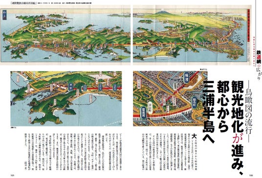 第56号では、開港当初の横浜を鳥瞰した「東海道名所之内横浜風景」や、関東大震災からの復興を記念して山下公園を中心に開催された「復興記念横浜大博覧会鳥瞰図」、戦争の焼け跡から立ち上がる横浜を描いた「神奈川観光大鳥瞰図」など、開港当初から数多くの鳥瞰図が制作された特異な街・横浜ならではの資料を再録しています。