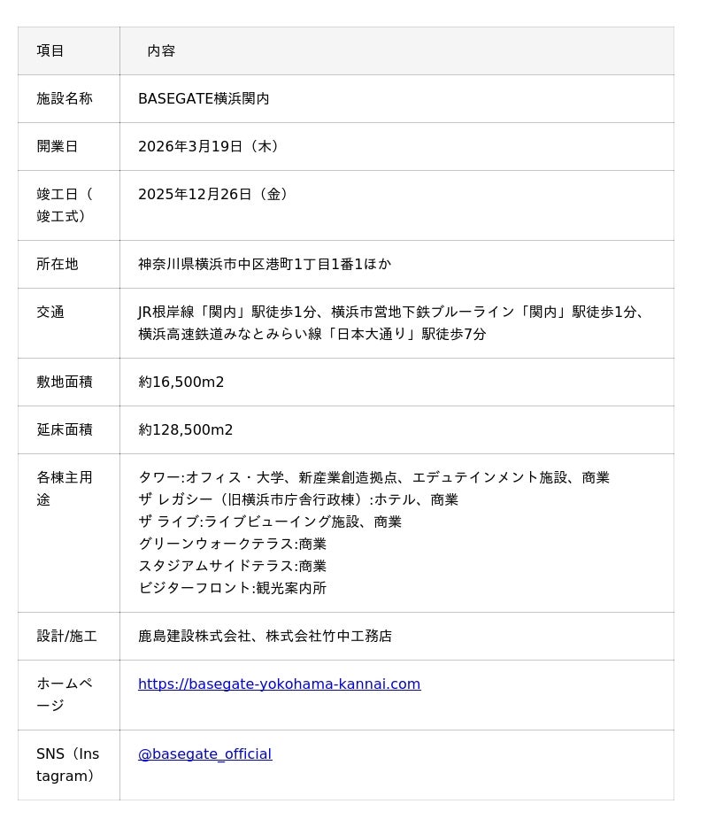 関内駅南口前の旧市庁舎街区を保護・活用する大規模ミクストユース型プロジェクト。BASE(拠点)+GATE(玄関口)に由来し、オフィス、ホテル、商業、文化・エンタメ機能などが集積します。建物竣工は2025年12月26日、街区開業は2026年3月19日。横浜スタジアムや日本大通りに近接し、日常の利便と観光回遊を両立します。