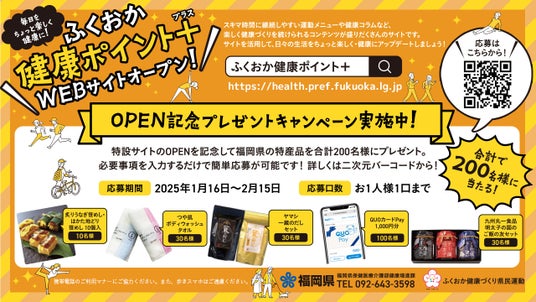 福岡県の公式健康アプリ「ふくおか健康ポイントアプリ」から、健康に関する情報をお届けする特設WEBサイトがオープン。合計200名様に福岡県の特産品が当たる抽選会も2月15日(土)まで開催中!