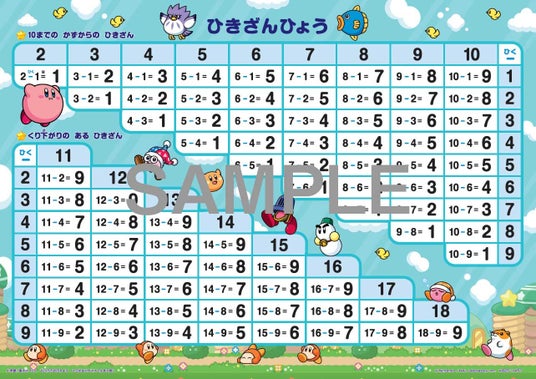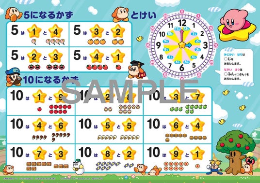 算数は「100までの数字」「たし算表」「ひき算表」「『5』と『10』の分解と時計の読み方」の4枚です。小学一年生までに習う文字と算数の基礎の内容をコンパクトにまとめてあります。カービィたちと楽しく、国語と算数をスタートしましょう!