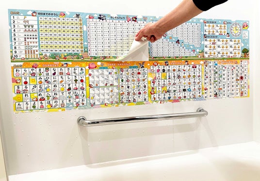 本書には、水だけでお風呂に貼れる特製シートが8枚入っています。1枚がA4サイズなので、シワにならずに貼りやすく、必要な分だけ貼ったりはがしたりできます。また、背景がつながっているので、4枚並べて貼れば大きなポスターになります。