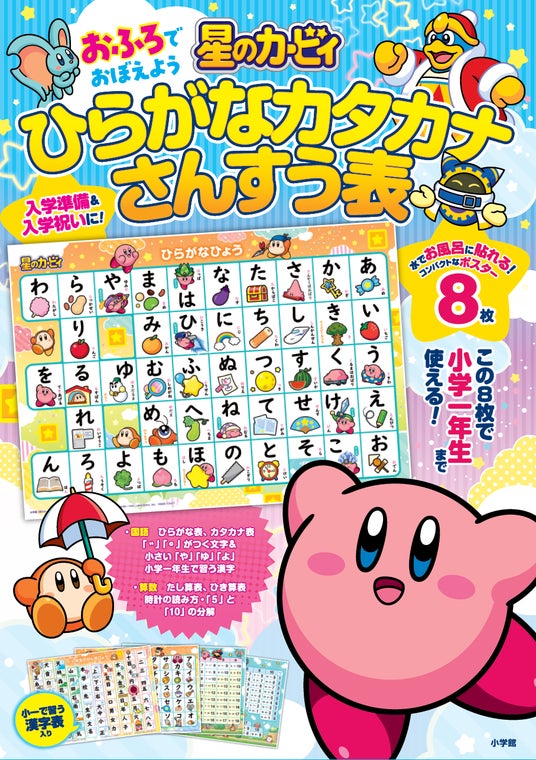 大人気「星のカービィ」デザインの幼児~小学一年生向けお風呂ポスターセットが、小学館より発売されました。昨年2月発売の『星のカービィ おふろでおぼえよう 九九表&ABCローマ字表』に続く第2弾で、今回のポスターは「ひらがなカタカナさんすう表」。毎日のお風呂時間を活用して、楽しく国語・算数をはじめましょう!