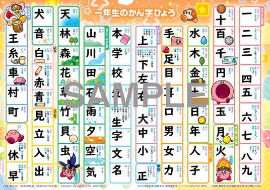 「星のカービィ」のキャラクターやアイテムをふんだんに使用したデザインのシートは、国語が「ひらがな表」「カタカナ表」、ひらがなとカタカナの「『゛』『゜』がつく文字&小さい『や』『ゆ』『よ』」「小学一年生で習う漢字」の4枚。