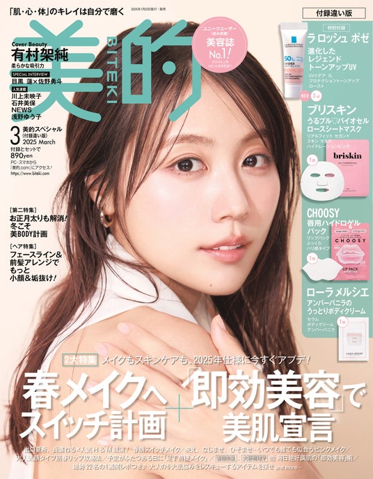 さらに、今月号には見逃せないスペシャルな付録もついてくる! 通常版、付録違い版の共通付録は、『美的』をはじめさまざまなメディアのベストコスメを総なめにしてきたラ ロッシュ ポゼのレジェンドアイテム「トーンアップUV ローズ」がパワーアップした「UVイデア XL プロテクショントーンアップ ローズ+」のミニサイズ版! 2月13日(木)の全国発売前に、その進化をぜひお試しください! もちろん、ほかにも付録が目白押し。『美的』3月号通常版、付録違い版は1月22日(水)発売です。