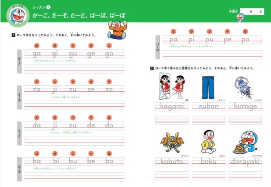 『ドラえもんはじめての英語ドリル アルファベット・フォニックス・ローマ字』は、《パート1》アルファベット(書き方と読み方)、《パート2》フォニックス(アルファベットの音のルール)、《パート3》ローマ字(書く練習)を音声とともに学べるドリル。この無料ダウンロード版ではパート3の一部を体験できます(音声は含みません)。