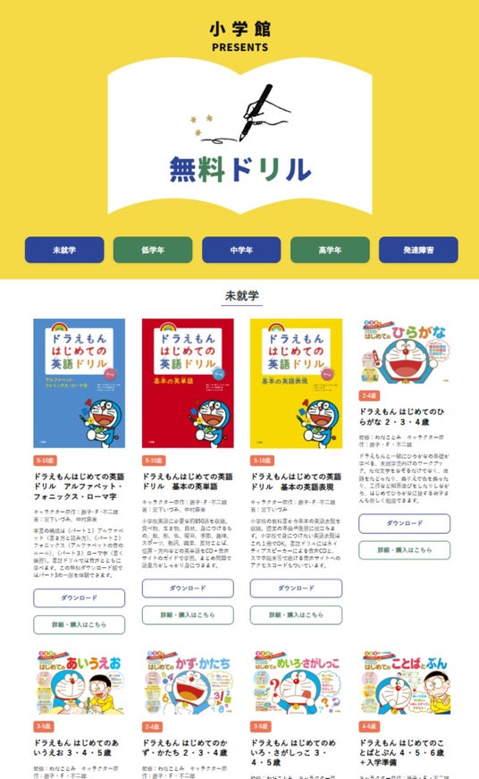 小学館の育児メディア【HugKum】の無料ドリルサイトが、2025年新学期の学習習慣を応援!『ドラえもん はじめての英語ドリル』シリーズが追加されて全53種に。